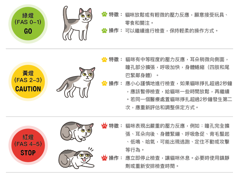 在觀察貓咪的肢體動作時,可以借鑒紅綠燈的概念,來判斷何時應該繼續檢查,何時應該停止。
