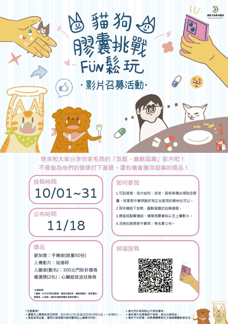 想讓你的毛孩輕鬆吃藥,還能獲得豐富獎品嗎?馬上參加我們的貓狗膠囊挑戰影片徵稿活動,和大家分享你家貓貓狗狗的「放鬆、幽默逗趣」瞬間吧!